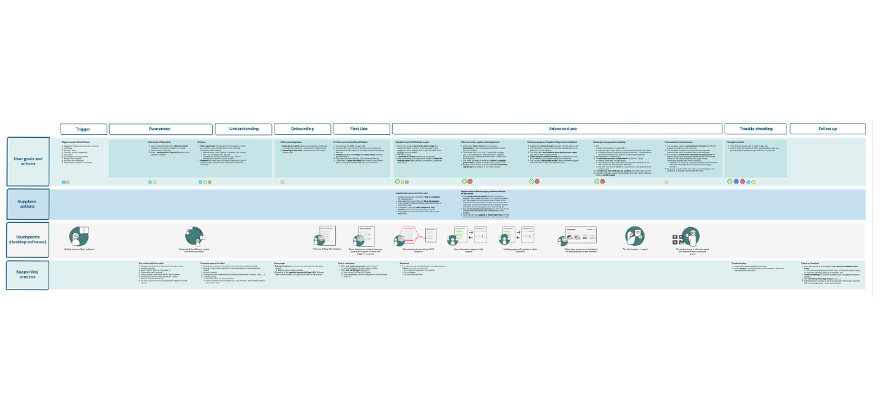 Drawn from the perspective of user goals and actions, supplier actions, touchpoints and supporting processes of Pilario, considering all the roles over time.